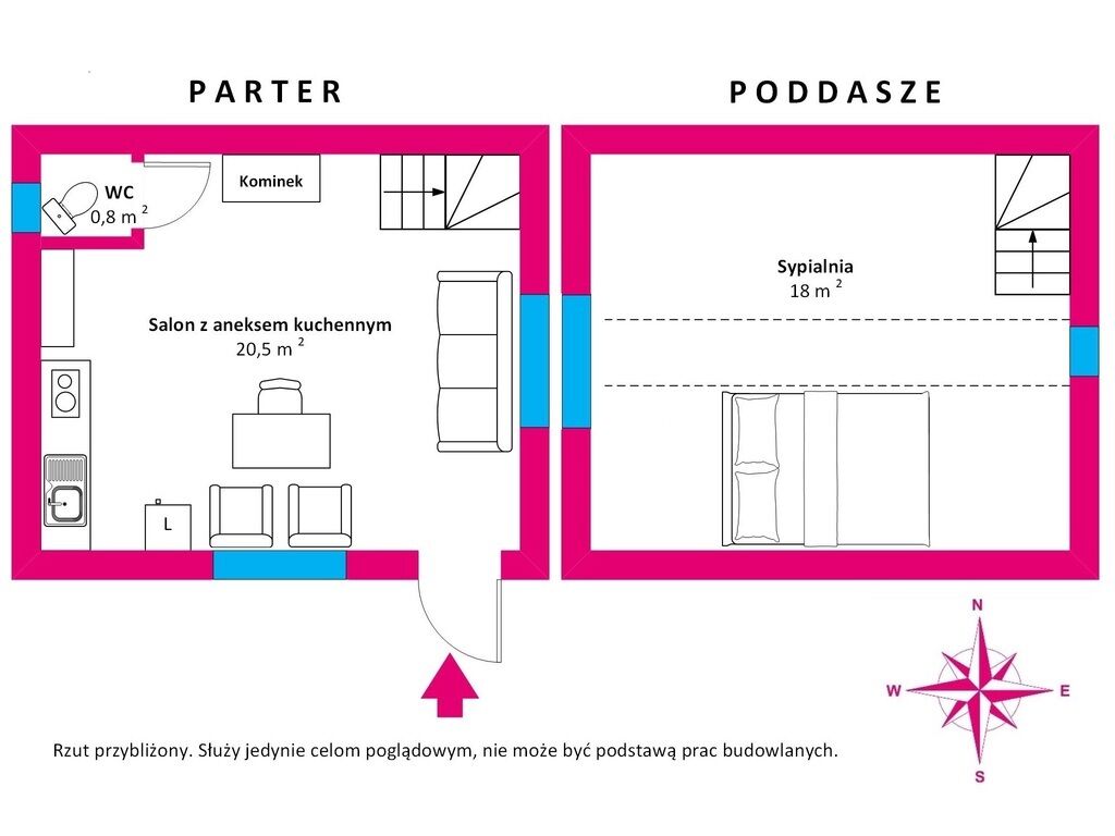kominkiem, wc ( schody na piętro), okna na stronę wschodnią i